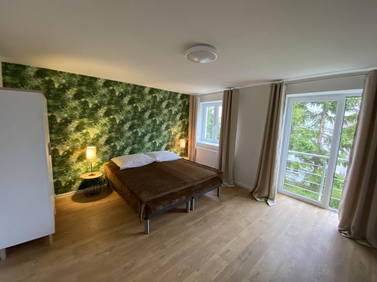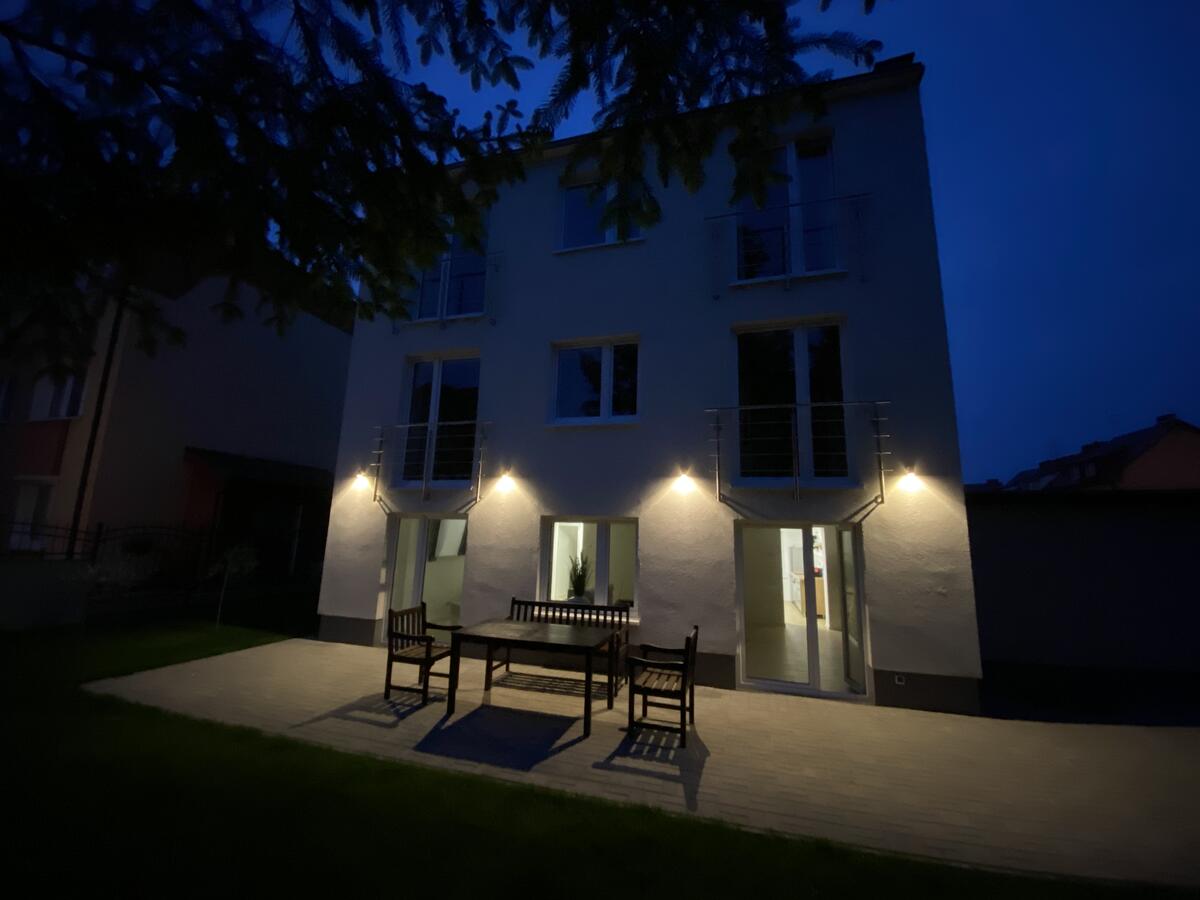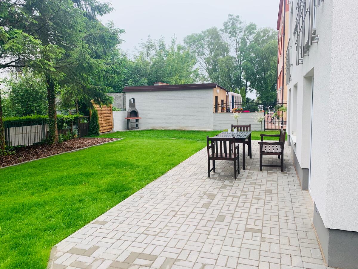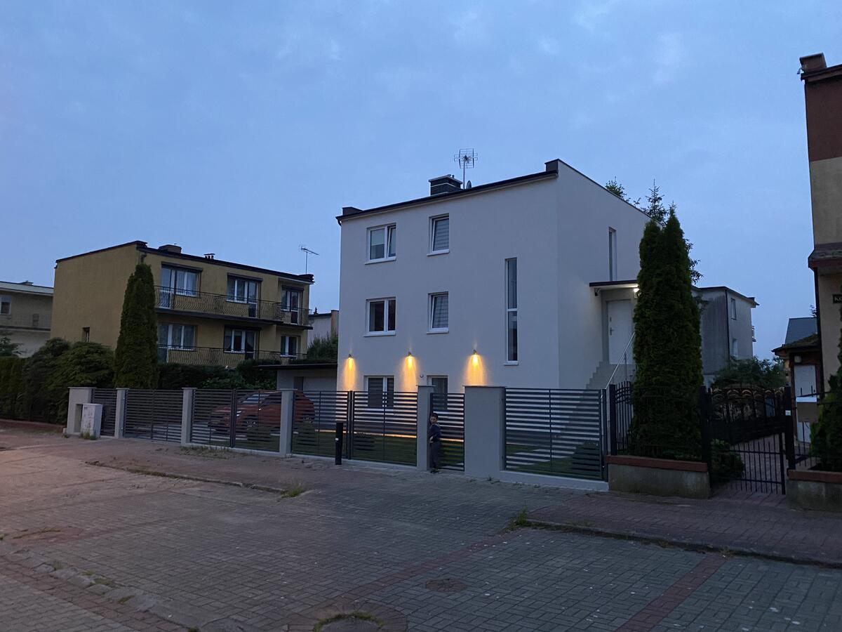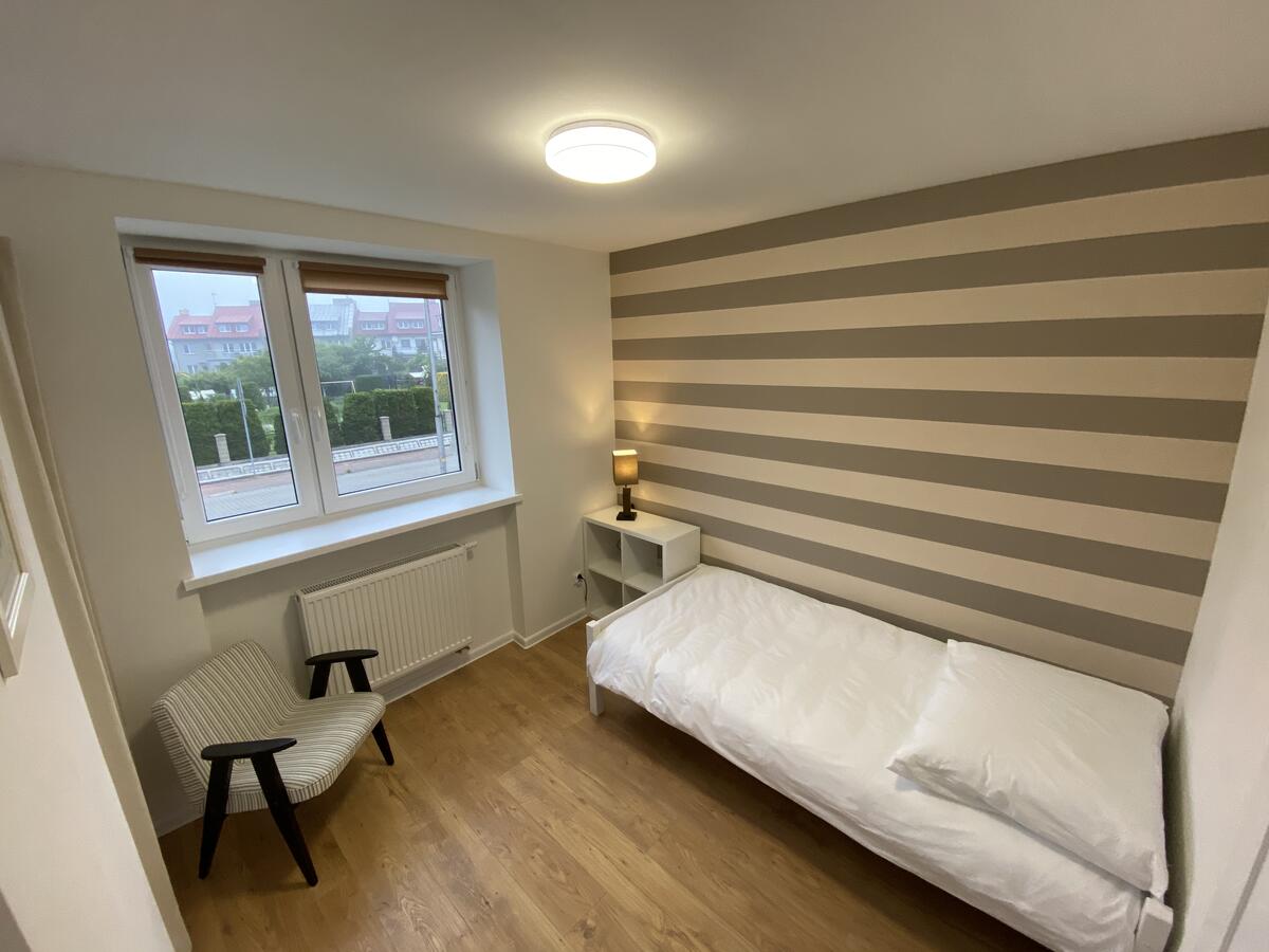 W budynku do dyspozycji gości: salon, 6 sypialni, dwie łazienki, kuchnia, wc, garaż, pralnia. Parking prywatny na dwa samochody oraz parking publiczny przy ulicy. Z salonu na parterze wyjście na ogród z grillem i taras z meblami ogrodowymi.