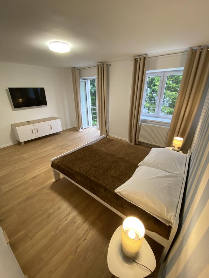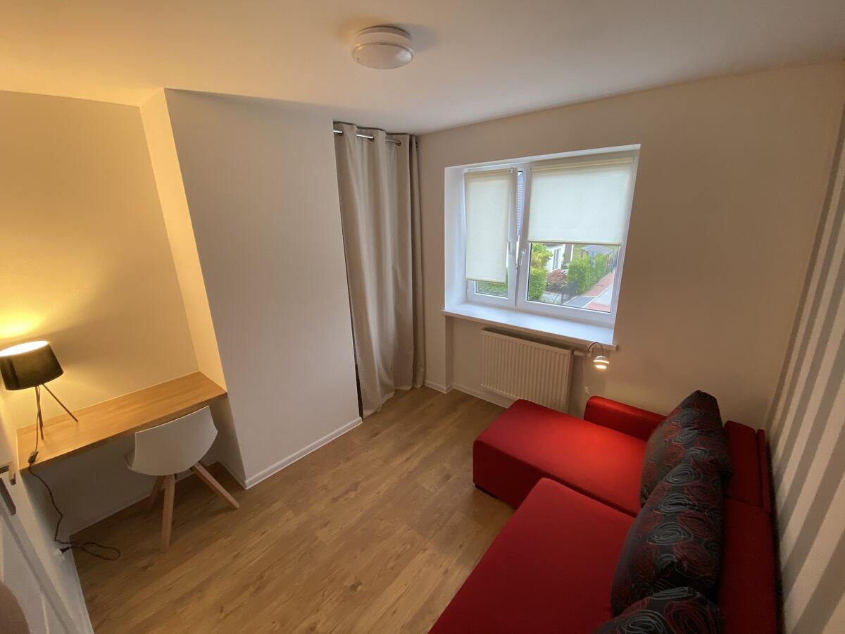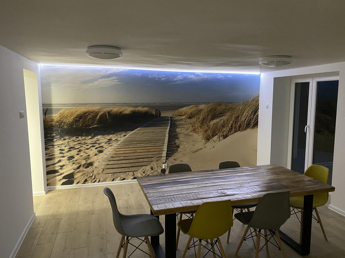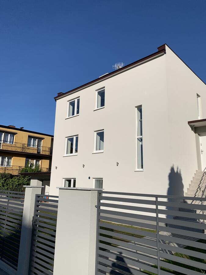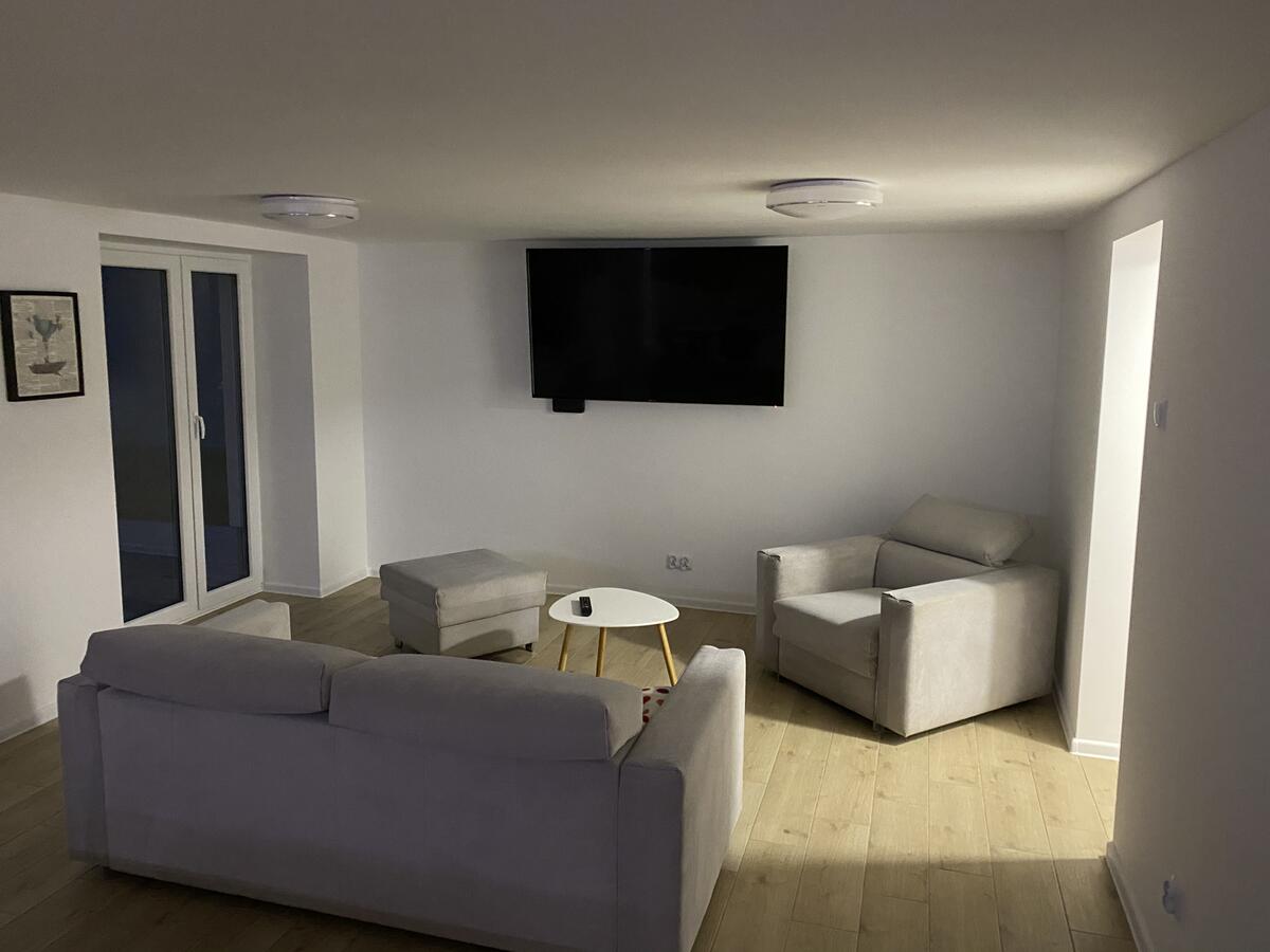W budynku do dyspozycji gości: salon, 6 sypialni, dwie łazienki, kuchnia, wc, garaż, pralnia. Parking prywatny na dwa samochody oraz parking publiczny przy ulicy. Z salonu na parterze wyjście na ogród z grillem i taras z meblami ogrodowymi.